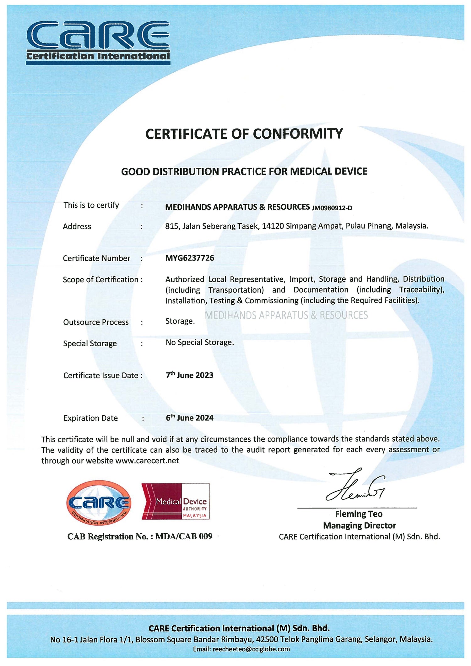 Our attainment of the GDPMD (Good Distribution Practice for Medical Device) certificate ensures the highest standards in medical device distribution. This certification guarantees compliance, quality, and product integrity, reflecting our commitment to providing reliable healthcare solutions.