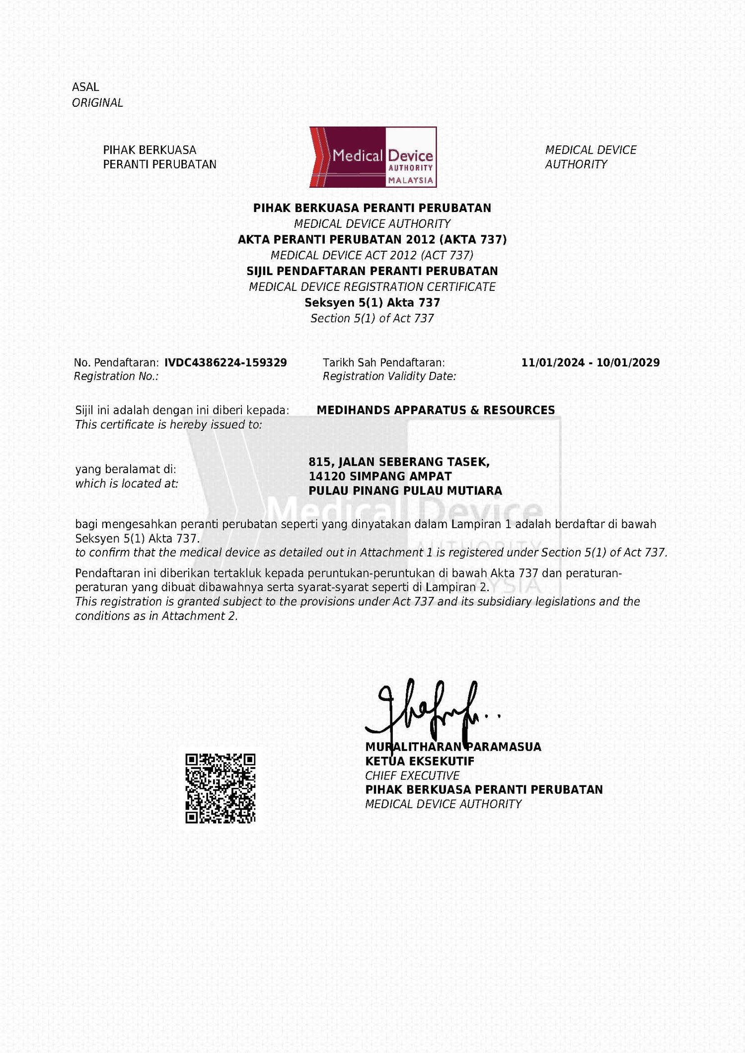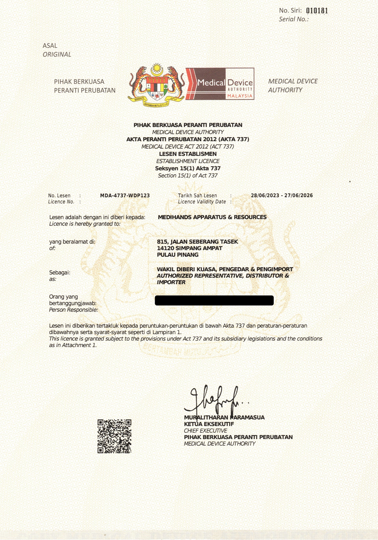 Medihands holds the MDA (Medical Device Authority) Establishment Licence, confirming our strict compliance with Malaysian regulatory standards. This certification assures customers of our commitment to product safety, efficacy, and regulatory adherence, reflecting our dedication to top-tier quality in healthcare solutions.